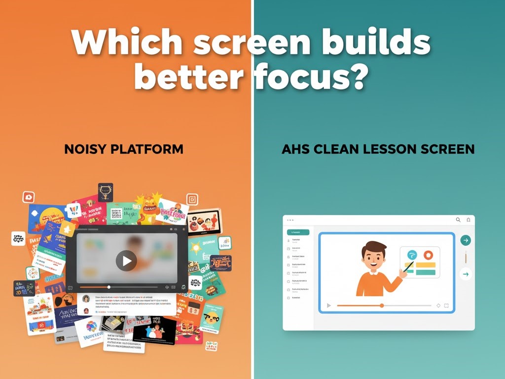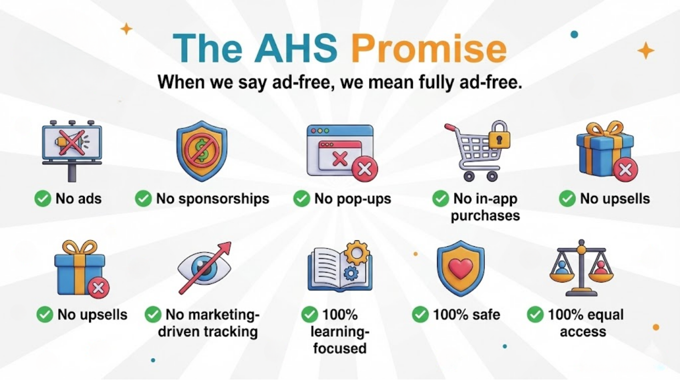 In today’s digital world, every learning platform is competing for one thing — your child’s attention. Pop-ups, ads, and paywalls sneak into lessons, interrupting focus and pulling young minds away from what truly matters: learning with clarity and calm. At AHS, we took a different path from the very beginning. Our mission has never been about clicks or conversions — it’s about focus. That’s why we made a promise that defines everything we do: