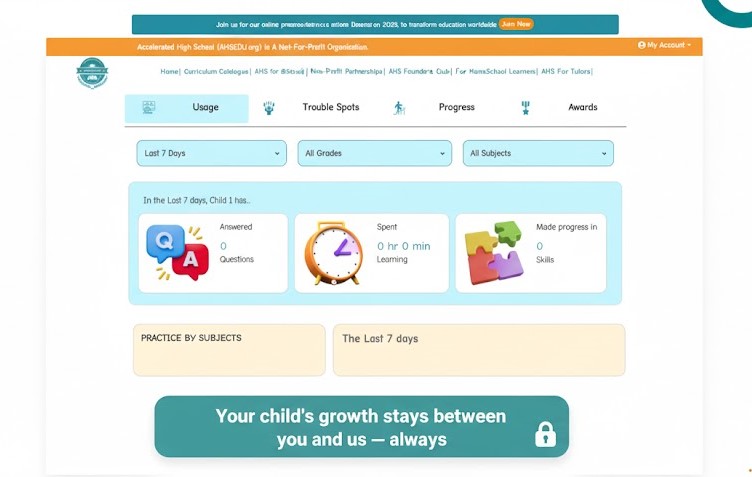 At AHS, your child’s progress and data are never tracked, sold, or shared for advertising purposes. Parents can confidently monitor growth, knowing every report and activity remains private. Teachers can focus fully on teaching — not on hidden analytics or marketing footprints. Because when students feel safe, they learn better. And when parents trust, learning thrives.
