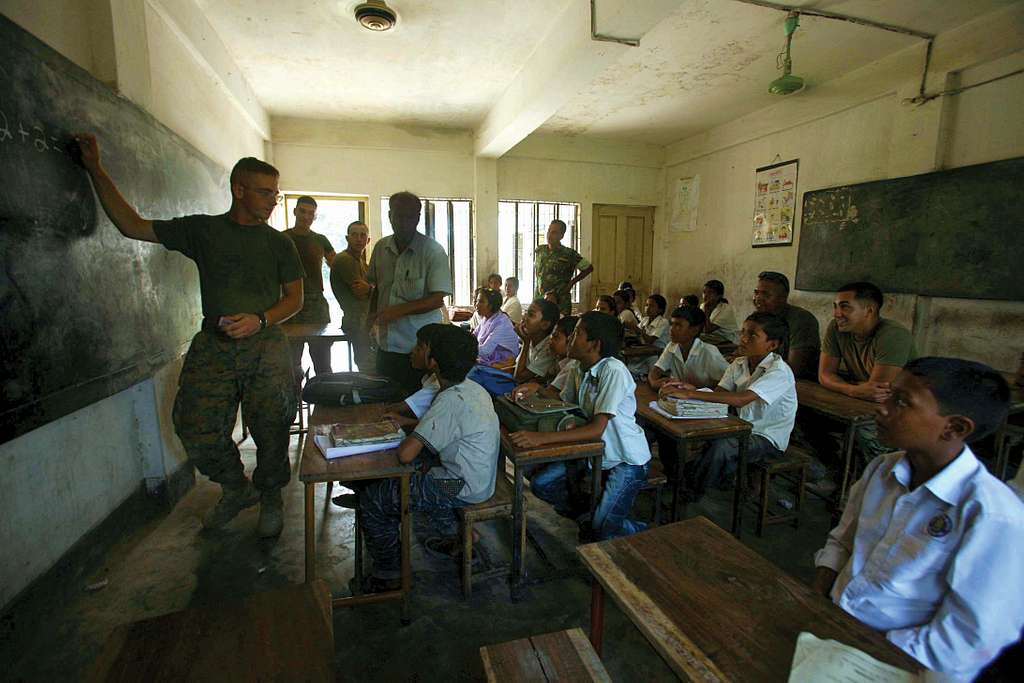 Pfc. Robert Wilkes, a combat engineer, assists in teaching students arithmetic during BIP ’11 in Chittagong, Bangladesh. Source: Defense Visual Information Distribution Service. https://picryl.com/