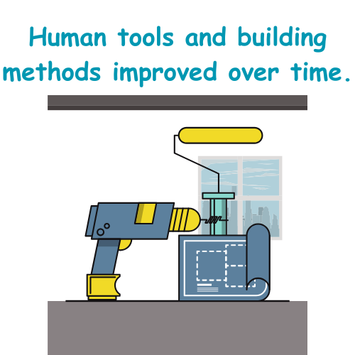 Text A: “Ancient people used stones as tools.” Text B: “Today, machines help us build large structures quickly.”